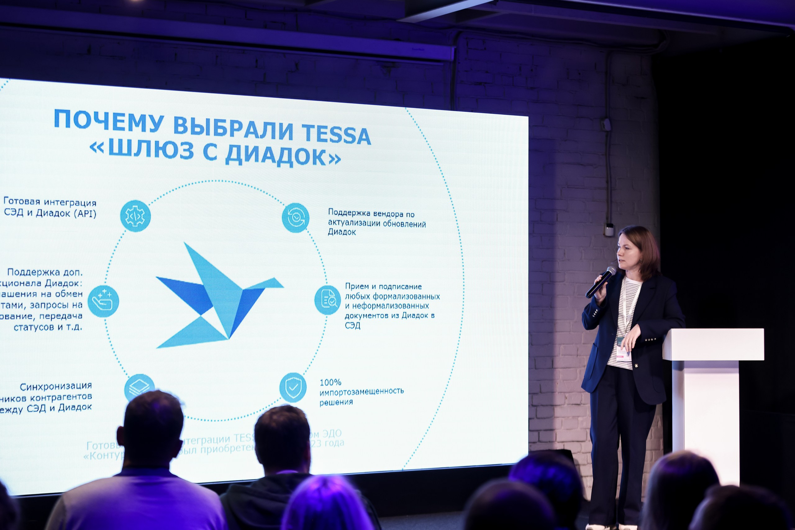 Павел Руденко, начальник архивного управления НПФ «Будущее», рассказал, как фонд выстроил в TESSA сквозные процессы — от создания номенклатуры дел до формирования актов уничтожения, превратив архив в автоматизированный центр управления документами.  Его коллега Ольга Шевченко, руководитель проектов НПФ «Будущее», представила кейс по автоматизации обработки бухгалтерских документов. Благодаря интеграции TESSA с «Контур.Диадок» все операции — от регистрации до подписания счетов, актов и УПД теперь выполняются в одном окне. Это решение кардинально упростило работу с большим объемом документов, освободив сотрудников от рутины и позволив сосредоточиться на задачах, приносящих прямую бизнес-ценность.