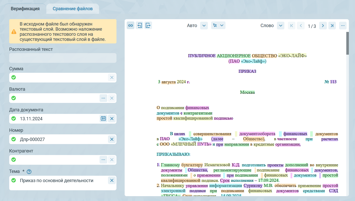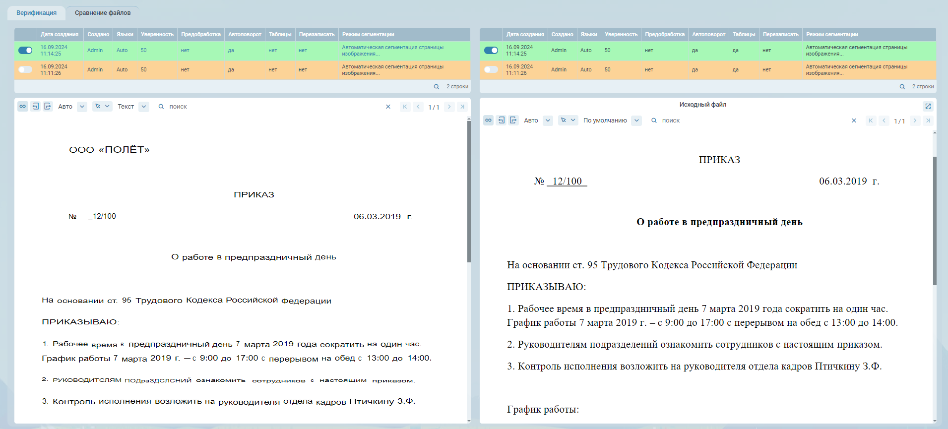 Если в исходном файле были найдены текстовые данные, то на вкладке Верификация будет отображено соответствующее сообщение. На вкладке Сравнение файлов имеется возможность сравнить исходный файл с распознанным. Для этого необходимо выбрать пункт контекстного меню Сравнить с исходным файлом на строке в таблице Запросы на распознавание.