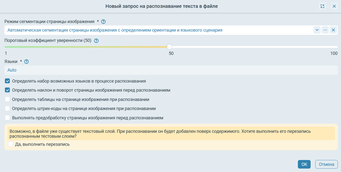 • Создание запроса на распознавание текста в файле с заданными параметрами.