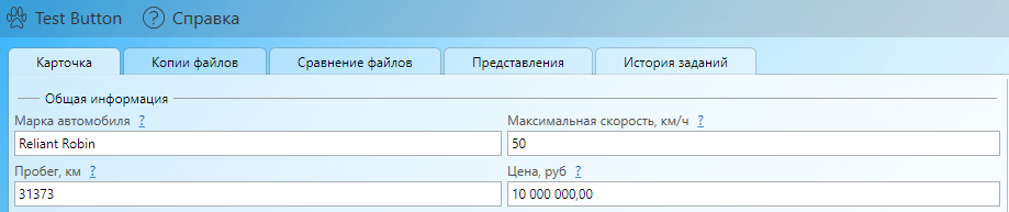 Пример отображения формы типа диалога можно найти в карточке “Автомобиль” (кнопка “Показать диалог”).