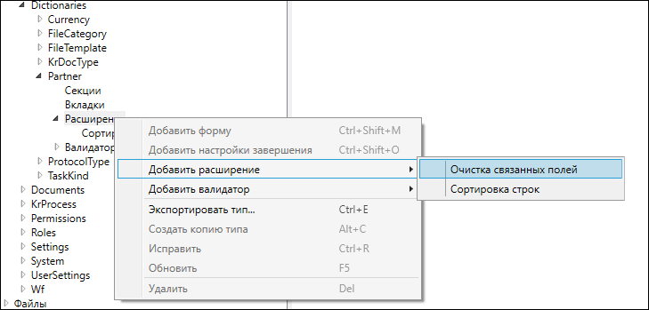 К типам карточек, диалогов и заданий можно добавить специальные расширения типа. Такие как, например, сортировка строк или очистка связанных полей. Это специальные платформенные настраиваемые расширения, которые призваны уменьшить количество программных расширений при настройке платформы.