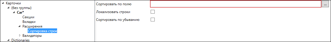 Расширение типа карточки, диалога и задания для сортировки строк. Позволяет производить сортировку строк в табличной секции по указанному в настройках полю из строки этой секции. Также позволяет производить локализацию значений перед сортировкой, чтобы отсортированные значения были упорядочены с учётом выбранного языка. Данный режим включается при установке флага “Локализовать строки”. По умолчанию направление сортировки - по возрастанию, но можно изменить направление, поставив флаг “Сортировать по убыванию”.