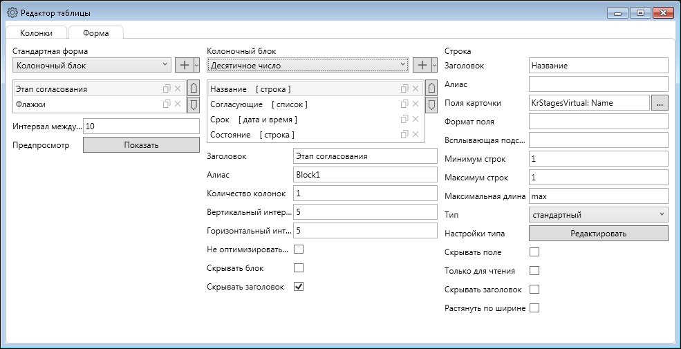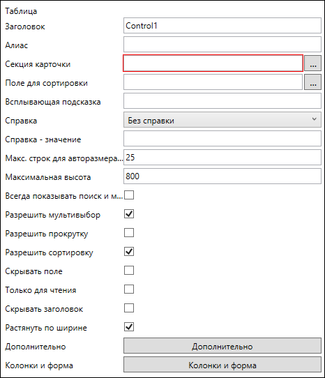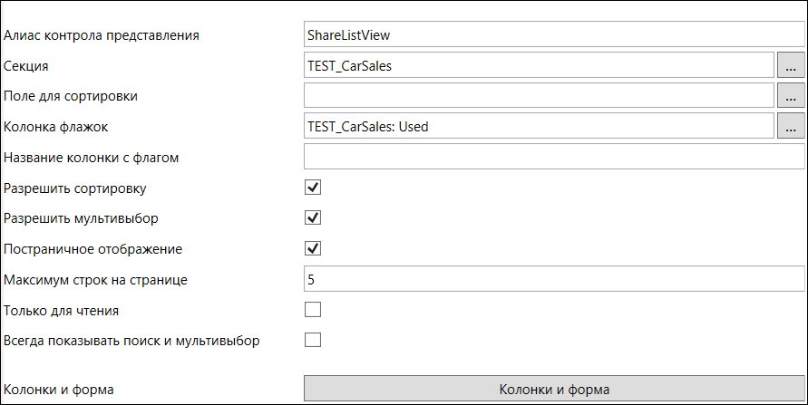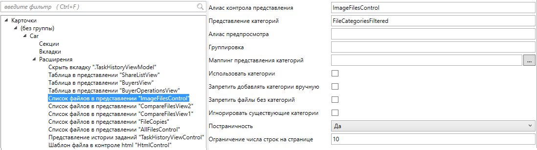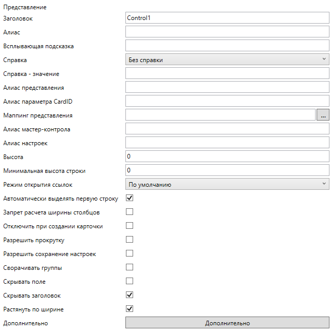 Для корректной работы расширения необходимо добавить в карточку элемент управления “Представление” с уникальным алиасом. Флажок Автоматически выделять первую строку должен быть выключен. В строке Алиас контрола представления задается уникальный алиас, указанный при создании контрола “Представление”.