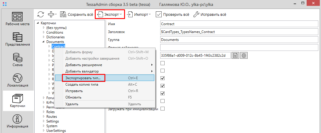 Для экспорта типа карточки необходимо выбрать в дереве нужный тип и далее с помощью контекстного меню или кнопки на панели инструментов выполнить экспорт: