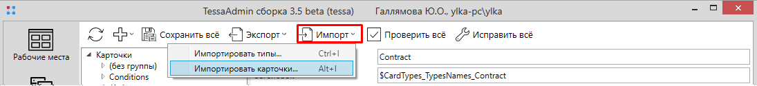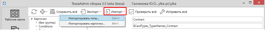 Импорт типов карточек выполняется с помощью кнопки на панели инструментов Импорт → Импортировать типы…: