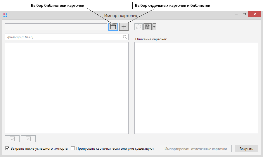 Импорт карточек выполняется с помощью кнопки на панели инструментов Импорт → Импортировать карточки…: