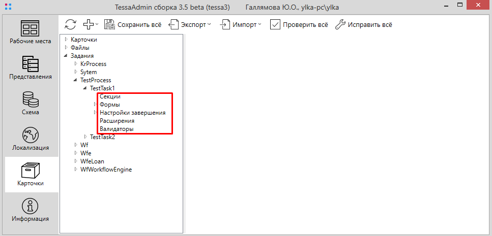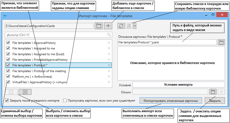 В Tessa Admin в разделе “Карточки” можно выполнять экспорт и импорт типов карточек, а также импорт карточек и создание библиотек карточек для импорта.