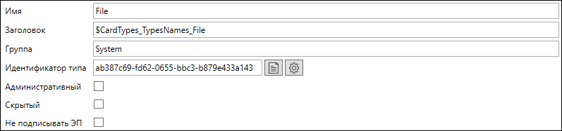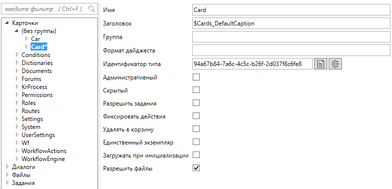 В данном разделе можно создавать, редактировать и просматривать типы карточек, типы карточек заданий и типы карточек файлов: