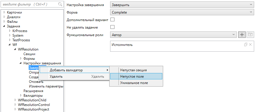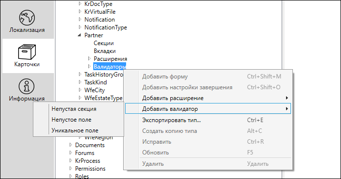 Добавить валидатор можно из контекстного меню, вызываемого кликом правой кнопки мыши на типе карточки или задания, пункт “Добавить валидатор”: