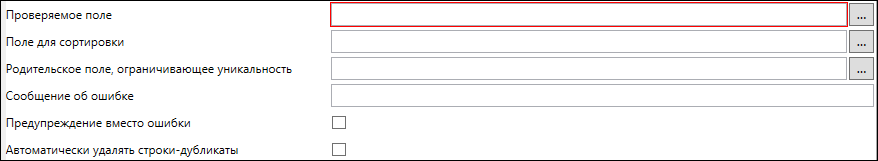 Проверяемое поле - поле, которое будет проверяться на уникальность. Может быть в строковой секции – тогда проверяется уникальность в рамках карточки в базе данных. Если в коллекционной секции, то в рамках текущей карточки.