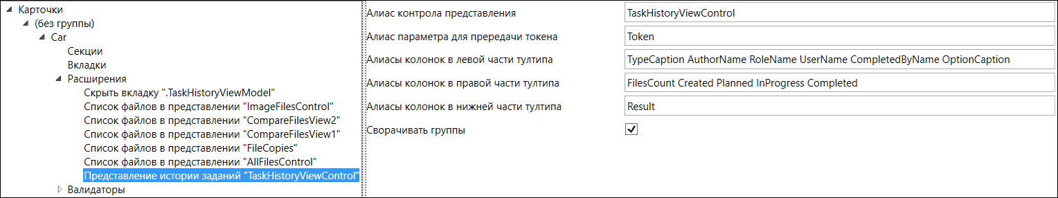 В настройке расширения “Алиас параметра для передачи токена безопасности” необходимо указать параметр представления, в который будет передаваться токен безопасности. В представлении, которое будет использоваться для отображения истории заданий, должен быть определен параметр, использующий тип данных String. Данный параметр не может быть использован в тексте SQL-запроса представления. Использование токена безопасности позволяет предотвратить просмотр истории заданий карточки пользователем, у которого нет прав на просмотр содержимого карточки. Для данного параметра рекомендуется использовать алиас “Token”, как в представлении TaskHistory.