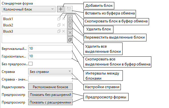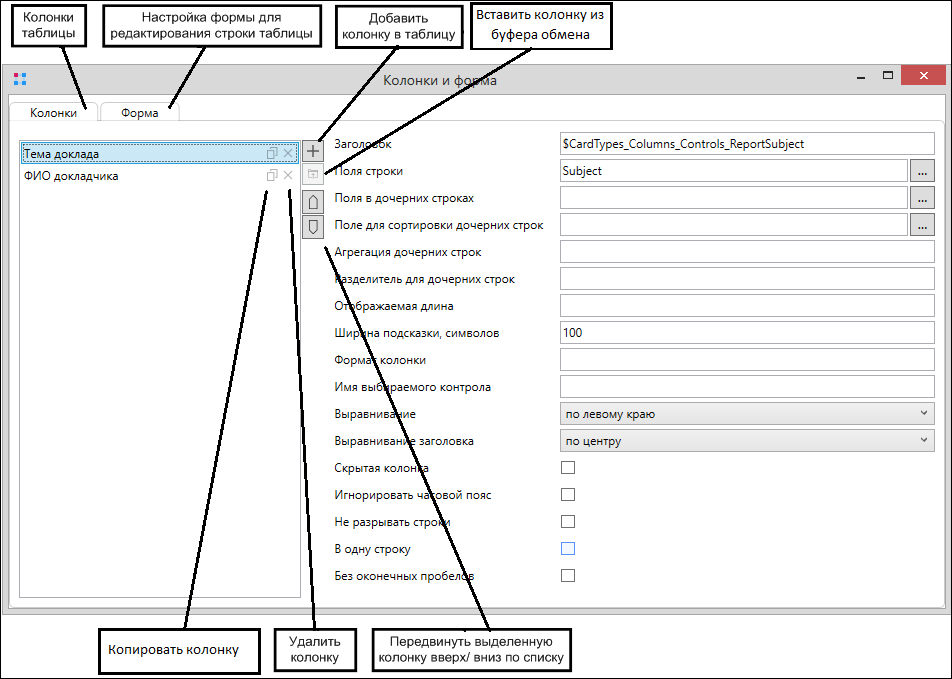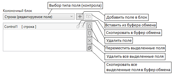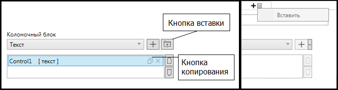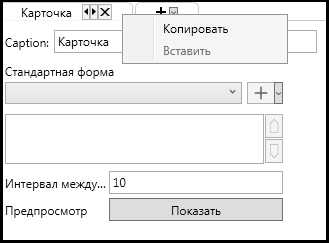 Элементы карточки (вкладки, блоки, контролы, колонки) можно копировать в рамках одной карточки, а также между двумя разными карточками. Для копирования и вставки блоков, контролов и колонок можно использовать как команды [Ctrl]+[C] и [Ctrl]+[V], так и специальные кнопки в интерфейсе. Копирование и вставка вкладок осуществляется только при помощи контекстных меню.