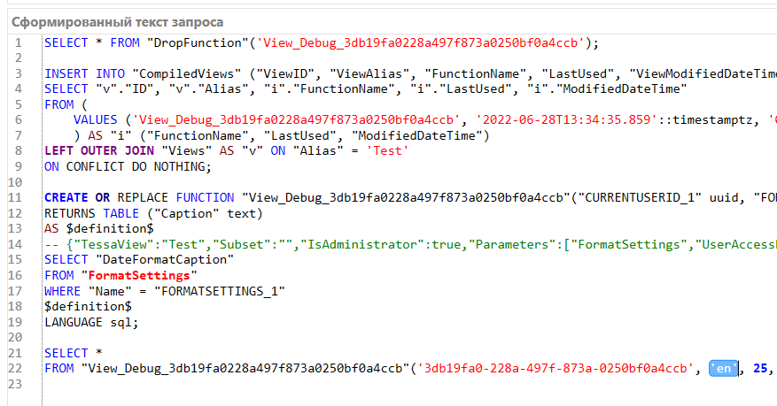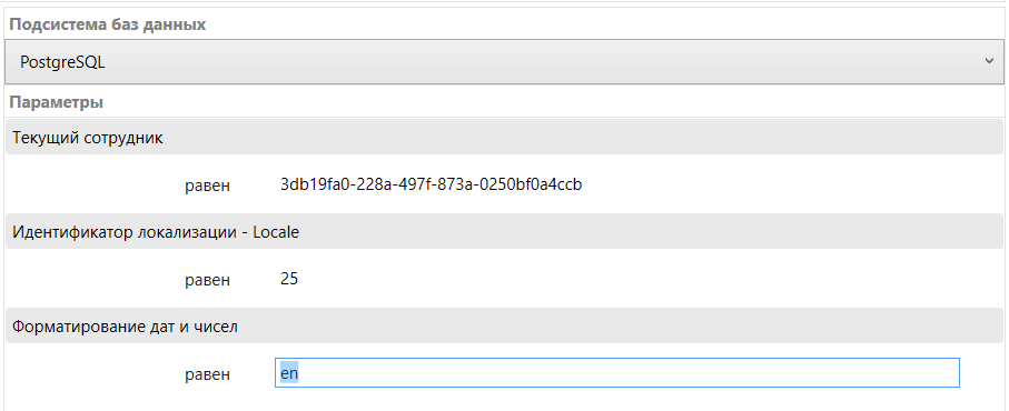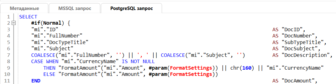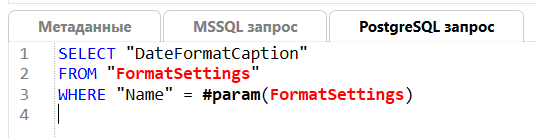 Это позволяет использовать форматирование в теле SQL-запроса, отфильтровав таблицу FormatSettings по колонке Name, передав в неё значение параметра #param(FormatSettings).