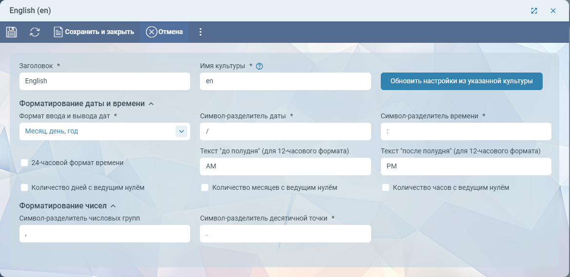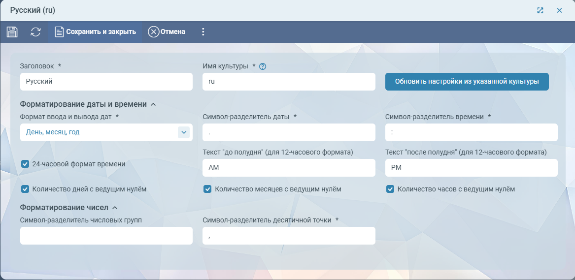 При создании карточки с параметрами форматирования рекомендуем заполнить имя культуры, после чего нажать на кнопку Обновить настройки из указанной культуры. После этого все поля карточки будут заполнены валидными значениями и, при необходимости, их можно скорректировать.