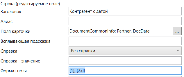 В формате поля {1}, {2:d} выводится имя контрагента из колонки PartnerName и далее, через запятую, дата документа DocDate, которая форматируется строкой d как дата без времени в соответствии с параметрами форматирования пользователя.