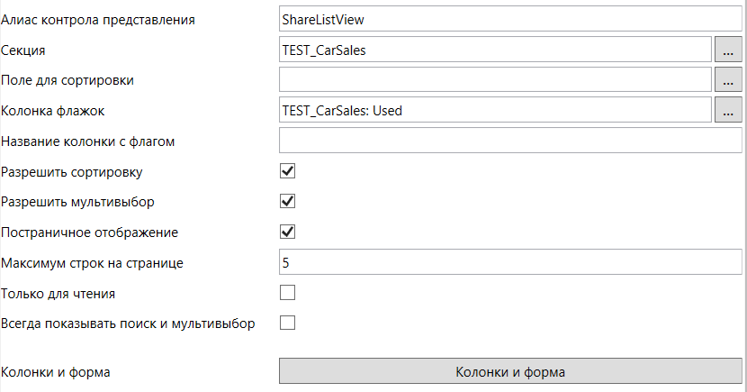 Если же с представлением связано расширение “Таблица в представлении”, то по кнопке Колонки и форма определяются настройки отображаемых колонок.