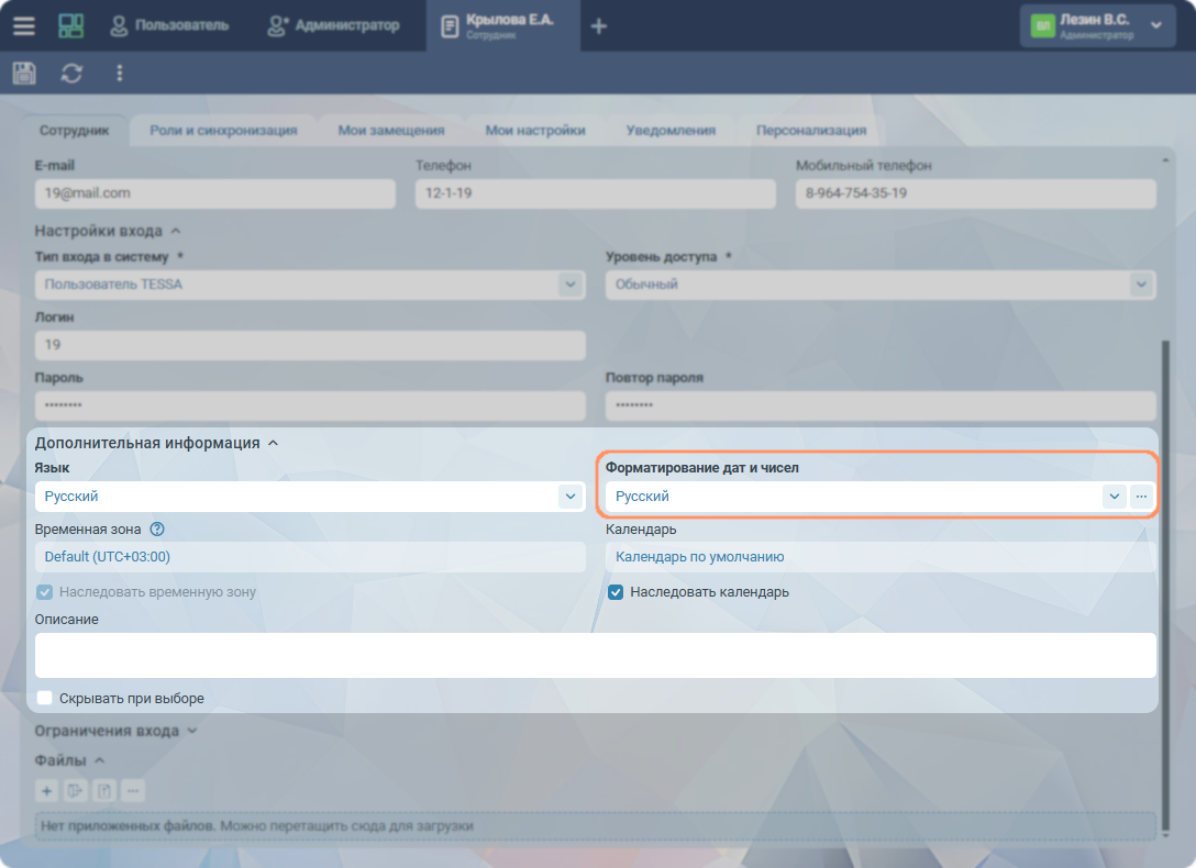 Перед первым логином пользователя администратор системы может открыть его карточку сотрудника, и заполнить предпочитаемое значение в поле Форматирование дат и чисел (в блоке полей Дополнительная информация). В этом случае автоматическое определение не будет выполняться.