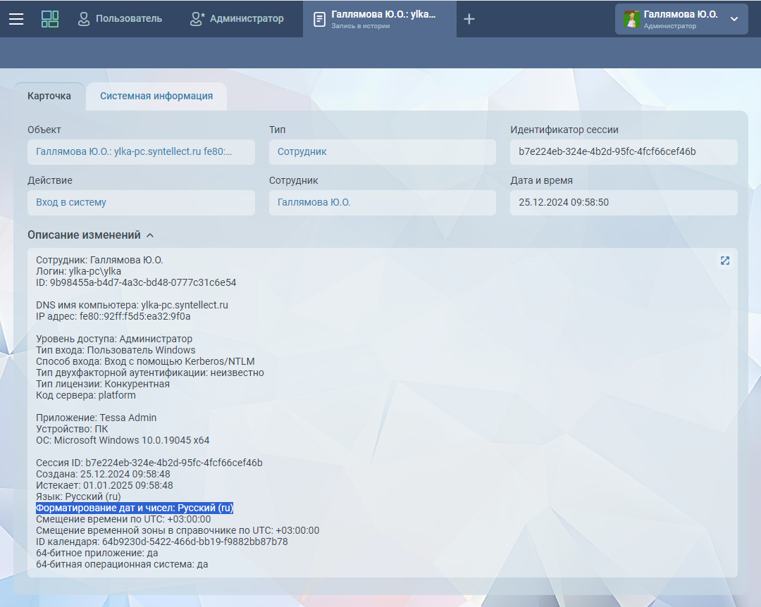В соответствии с настройками сотрудника для каждой сессии назначаются параметры форматирования. Администратору системы эта информация доступна в истории действий в записи типа “Вход в систему”.