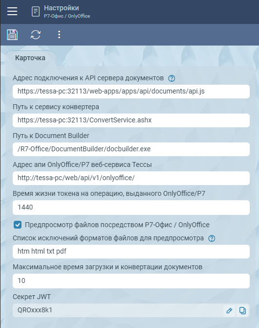• Адрес апи OnlyOffice/Р7 веб-сервиса Тессы - для работы плагина преобразования файлов в pdf с сервисом Р7-Офис / OnlyOffice.