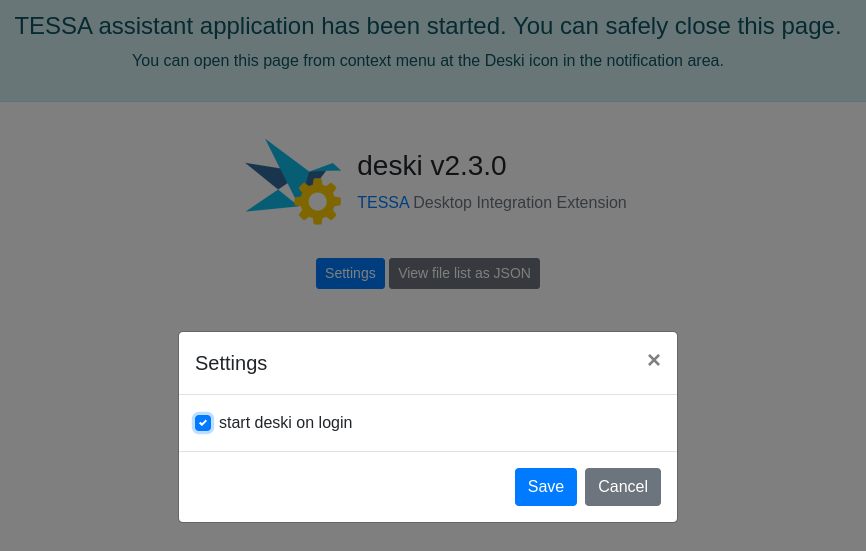 [Desktop Entry] Type=Application Name=TESSA Desktop Integration Extension Exec="/home/USER_NAME/deski/deski" "-dont-open-browser" X-GNOME-Autostart-enabled=true