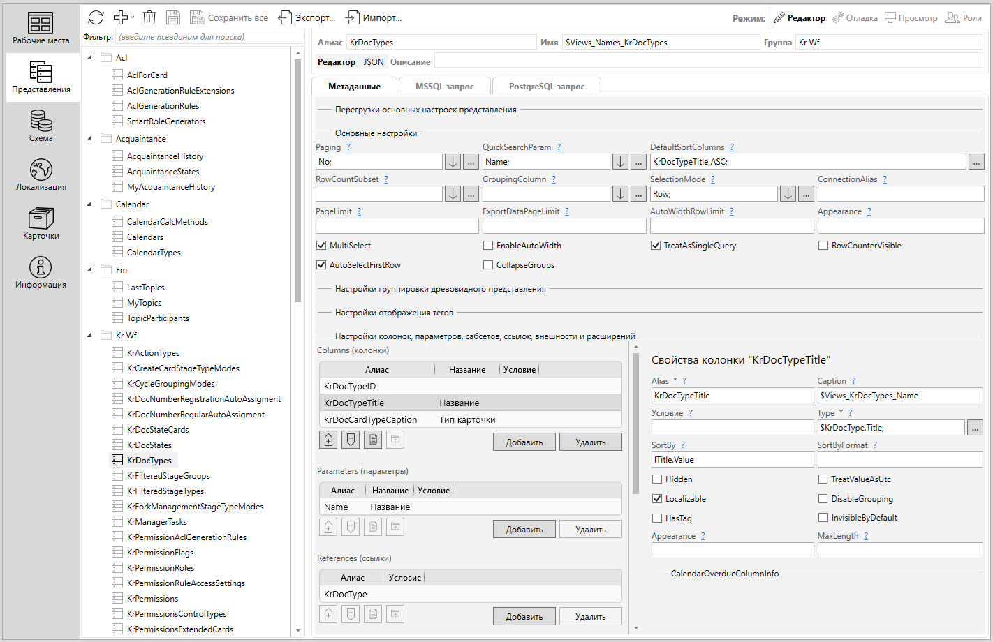 • CardTypeColunm – поле, в котором можно указать алиас колонки, где хранится алиас типа карточки.