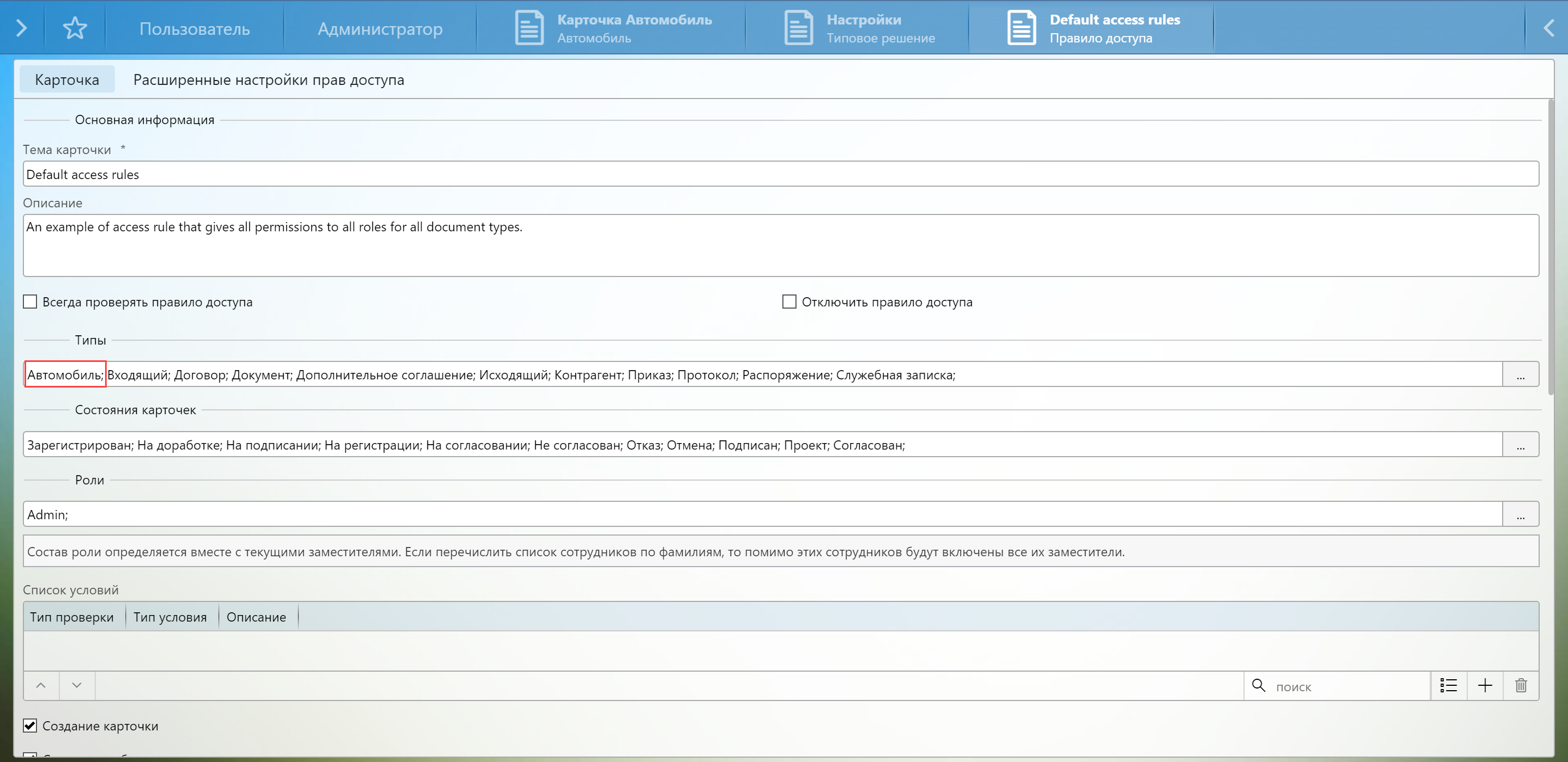 Для дальнейшей работы с тестовой карточкой, необходимо добавить тип карточки Автомобиль в дефолтное правило доступа.