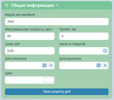 В тестовой карточке Автомобиль в блоке Общая информация добавляется кнопка Open property grid.