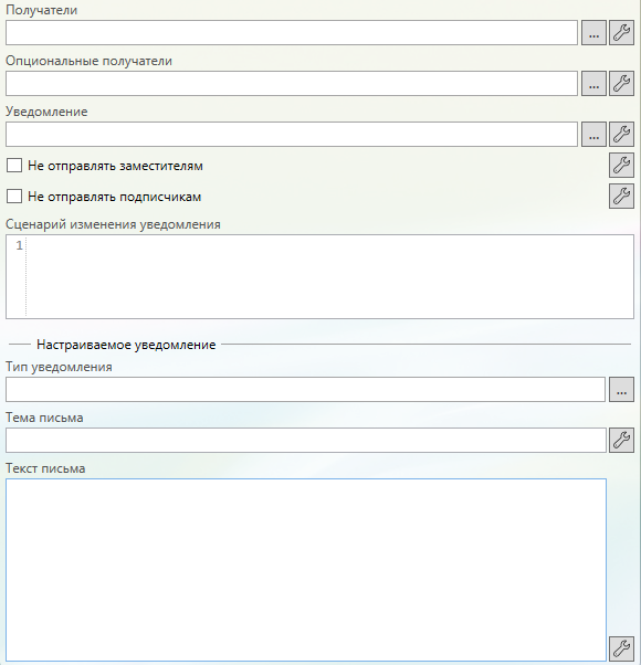 Не отправлять подписчикам (значение типа boolean, может быть привязано к параметрам процесса) - определяет, нужно ли при формировании списка получателей уведомления учитывать сотрудников, имеющих подписку на данный тип уведомления для обрабатываемой карточки.