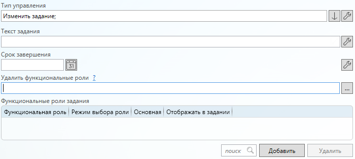 Функциональная роль (значение из справочника функциональных ролей) - выбор функциональной роли, с которой будет добавляться роль из списка “Роли” в список связанных с заданием ролей.