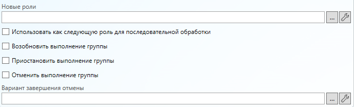 Новая роль (значение из справочника ролей, может быть привязано к параметрам процесса) - если данное поле задано и имеет значение, то данная роль добавится в список исполнителей для группы заданий. Если обработка заданий параллельная и выполнение группы не приостановлено, то задание на роль отправится сразу же.