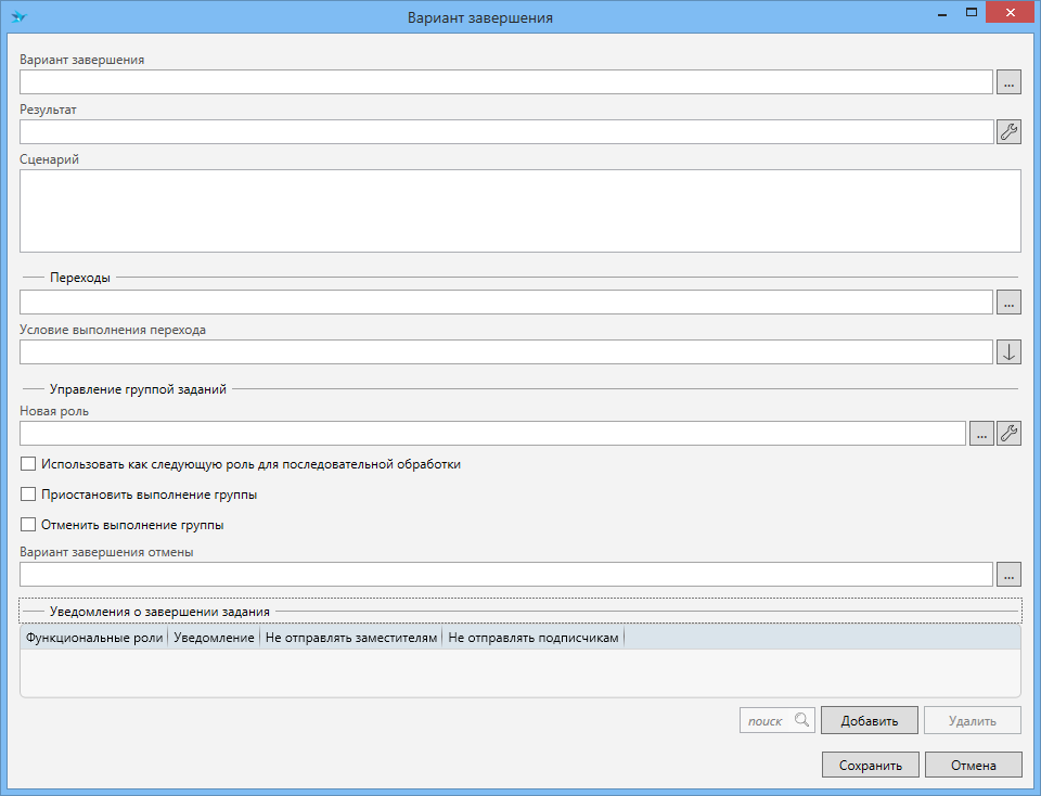 Вариант завершения (значение из справочника вариантов завершений) - определяет, при завершении задания с каким вариантом завершения должна производиться обработка из данной строки таблицы.