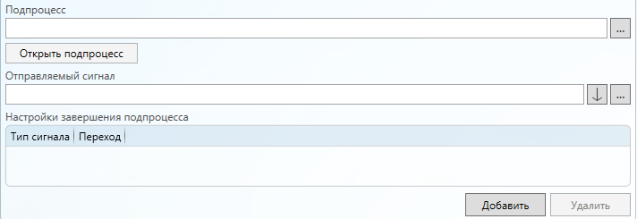 Данное действие позволяет управлять действиями Подпроцесс. Управление производится путем изменения типа текущего сигнала и отправки его по исходящим связям (или следующим действия в узле). Данное действие формирует сигнал управление подпроцессом (тип сигнала SubprocessControl) и в параметры процесса передает отправляемый в подпроцесс сигнал.
