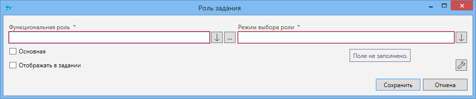 Только одна запись может быть с флагом “Основная”. Это может быть либо одна из записей таблицы “Функциональные роли задания”, либо запись, добавляемая на основе списка “Роли”. Система автоматически предупредит и предложит исправить ошибку при попытке добавить более одной записи с флагом “Основная”.