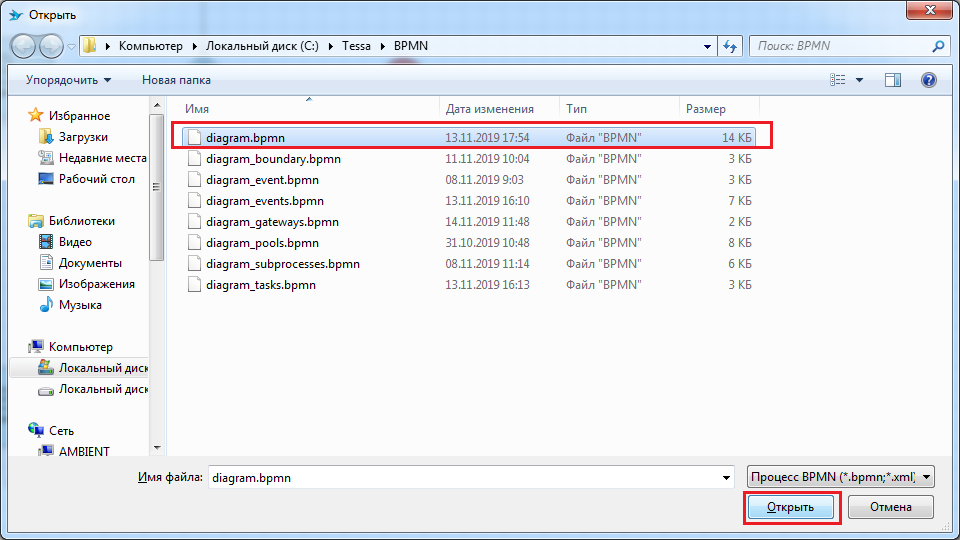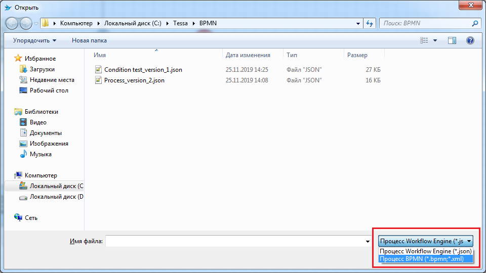 В открывшемся окне выбираем тип файла - Процесс BPMN.