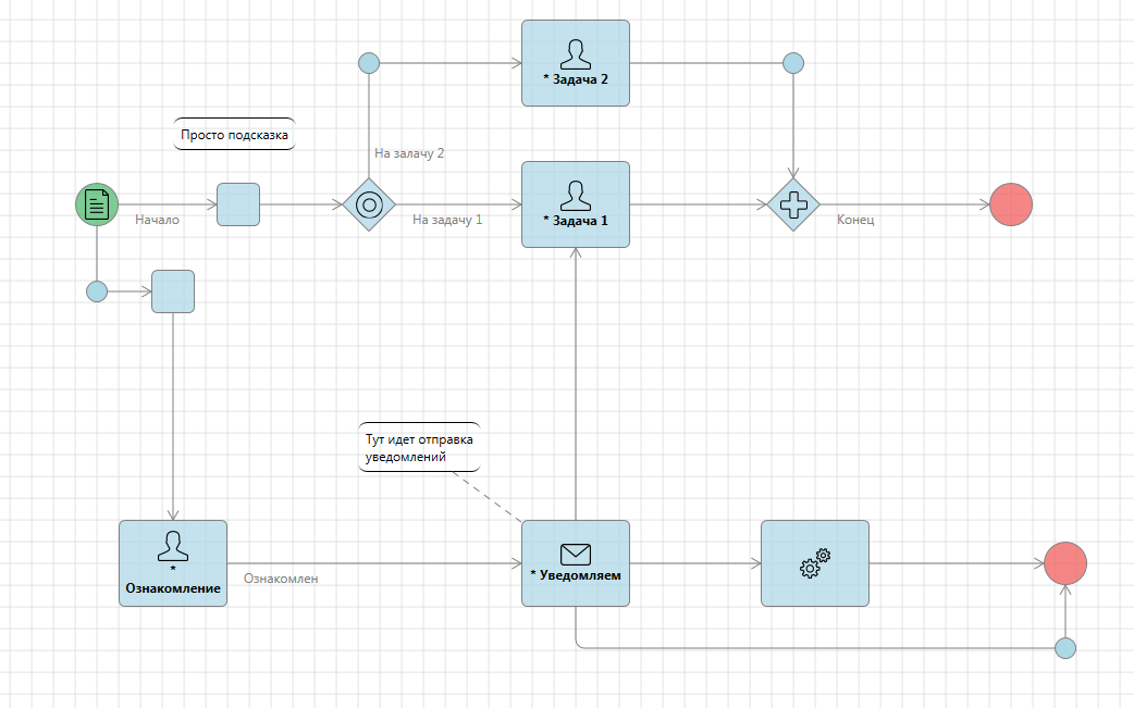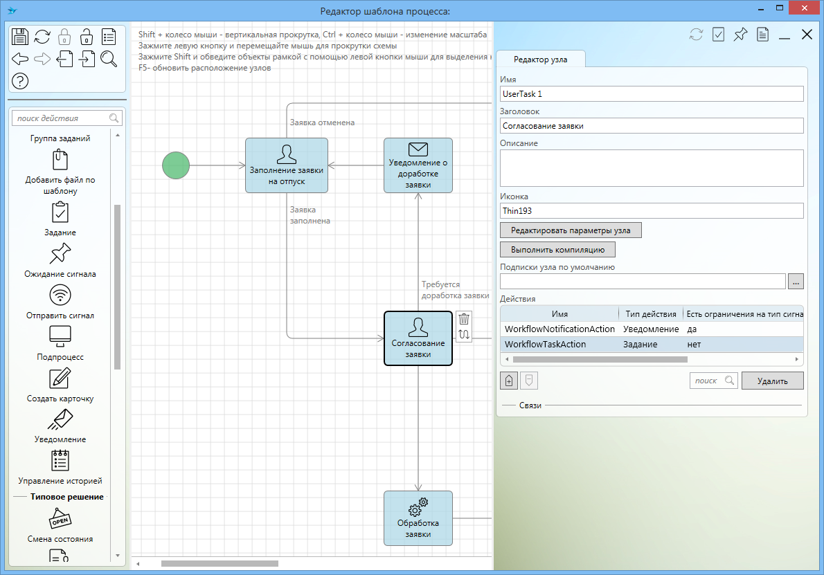 Далее рассмотрим узлы Уведомления руководителя и Согласование заявки. По придуманной нами логике данные узлы должны отправить уведомление руководителю и отправить ему задание на согласование соответственно. Конструктор позволяет поместить несколько последовательно выполняемых действий в один узел. Поэтому мы можем упростить наш процесс, объединив в один узел Согласование заявки и отправку задания и отправку уведомления.