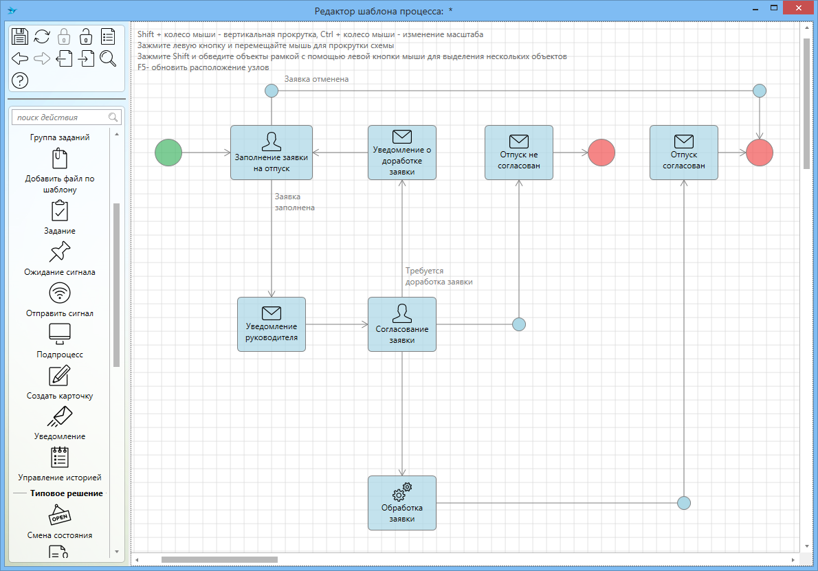 Рассмотрим абстрактный процесс согласования заявки на отпуск. В нотации BPMN он мог бы выглядеть примерно следующим образом: