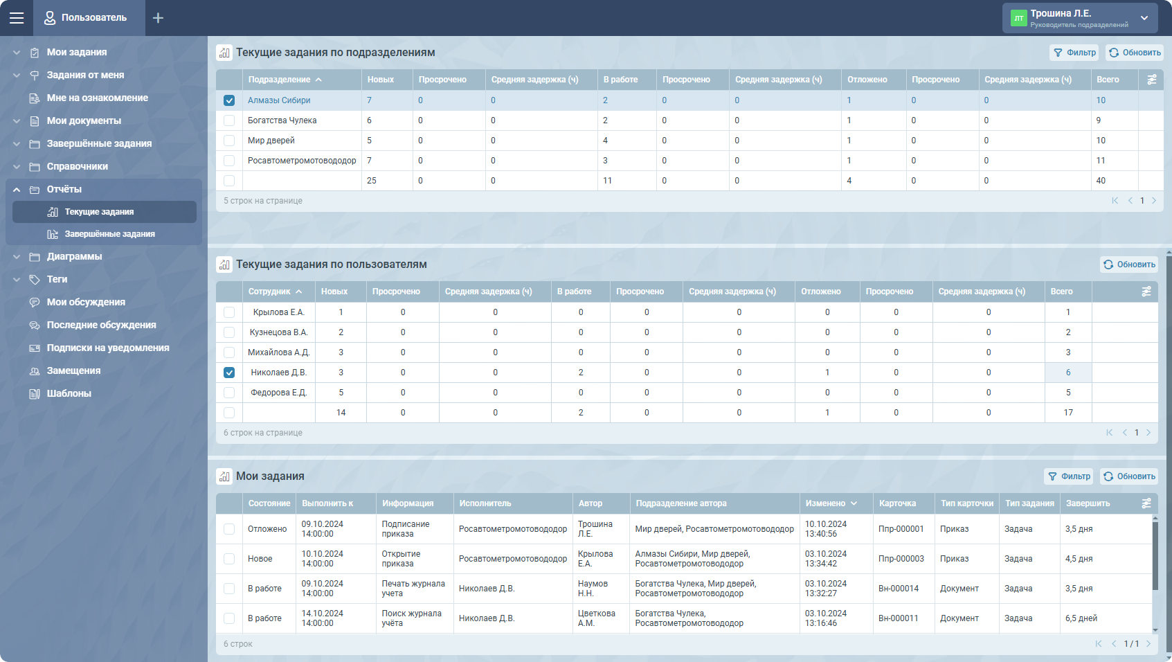 - Текущие задания по пользователям – количество заданий в разных состояниях по каждому доступному сотруднику в выбранном подразделении;