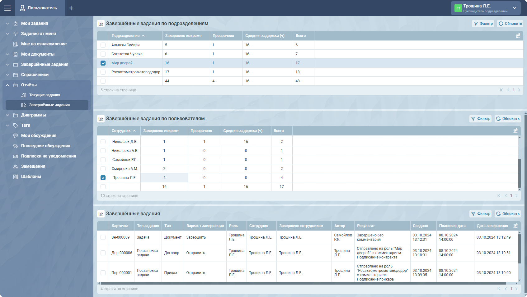 - Завершённые задания по пользователям – количество завершённых заданий по каждому доступному сотруднику в выбранном подразделении;