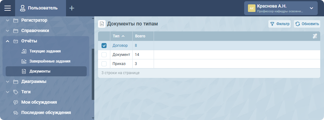 Для открытия отчёта по документам необходимо открыть представление Отчёты -> Документы.
