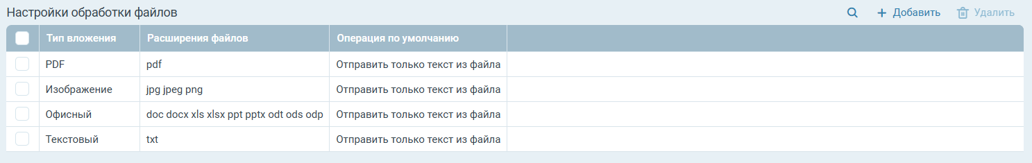 Таблица Настройки обработки файлов содержит список всех типов вложений, доступных для обработки ИИ ассистентом, а также соответствующих им расширений файлов. Колонка Операция по умолчанию содержит следующие типы обработки содержимого файла: