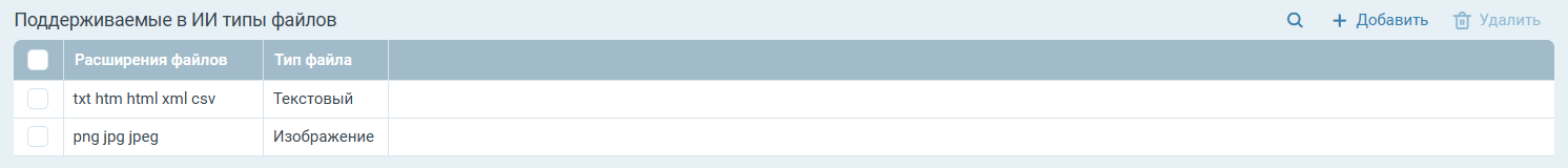 Таблица Поддерживаемые в ИИ типы файлов позволяет задавать типы файлов на основе их расширений. Данные настройки определяют тип файла, который будет указан при его отправке в ИИ без предварительной обработки. Колонка Тип файла содержит следующие типы: