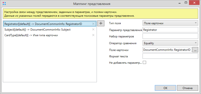 Для корректной работы расширения необходимо добавить в карточку элемент управления “Представление” с уникальным алиасом. Флаг Автоматически выделять первую строку должен быть установлен. В поле Алиас представления задается уникальный алиас, указанный при создании контрола “Представление”.