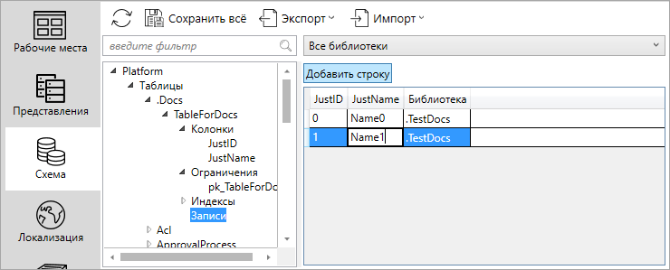 После создания библиотеки объекты схемы можно перенести в неё: таблицы, колонки, записи, функции и т.д.: