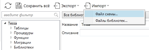 Чтобы импортировать схему данных из файлов, необходимо выбрать Импорт -> Файл схемы… на тулбаре раздела.