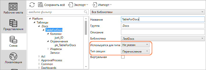 - Для таблиц с типом секции “Перечисление” позволяет указывать значение в строках таблицы “Записи”, чтобы оно было доступно в редакторе и в метаинформации (через API), но отсутствовало в строках в БД.