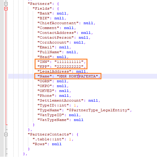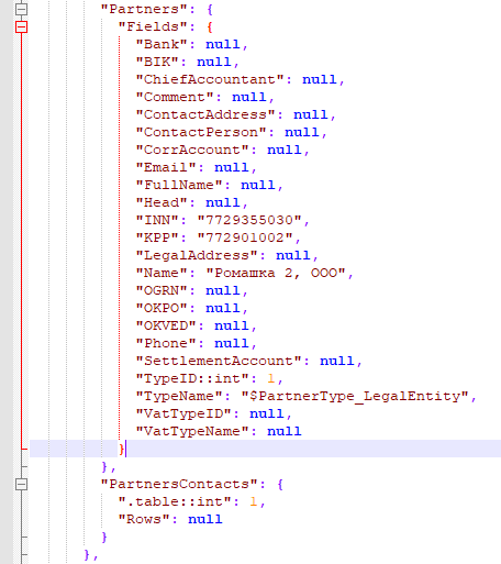 Теперь выгрузим эту карточку. В левой панели выберите тайл “Системные→Экспорт карточки” и сохраните карточку в какую-нибудь директорию. В ней будет создан файл “ИМЯ_КОНТРАГЕНТА.jcard”. Это выгруженная в формат json карточка, которую мы будем использовать как шаблон. Откройте этот файл в любом текстовом редакторе и найдите в нем строки, которым мы вводили для полей контрагента “ИМЯ_КОНТРАГЕНТА”, “1111111111” И “2222222222”.