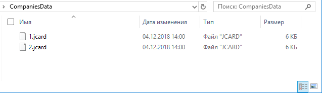 Теперь в отдельной папке “CompaniesData” (имя выбрано для удобства и может быть любым) создадим две копии этого файла, первый назовем “1.jcard”, второй “2.jcard” (имена файлов могут быть любые). Единственные изменения, которые нужно сделать в этих файлах - задать нужные имя контрагента, ИНН и КПП. Никаких других изменений делать не надо. Мы сделаем это ручным редактированием, но, разумеется, этот процесс может быть легко автоматизирован, чтобы, например импортировать данные из Excel (при помощи не сложного макроса) или из любой другой системы.