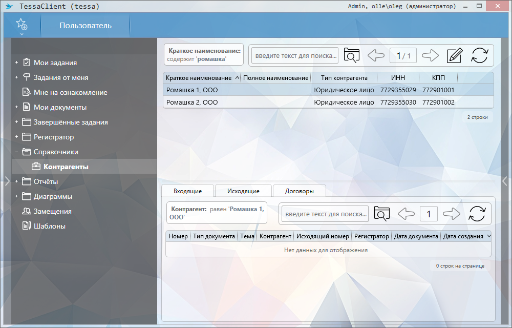 Давайте на примере контрагентов посмотрим, как это работает. Попробуем импортировать в систему двух контрагентов “Ромашка 1” и “Ромашка 2”.