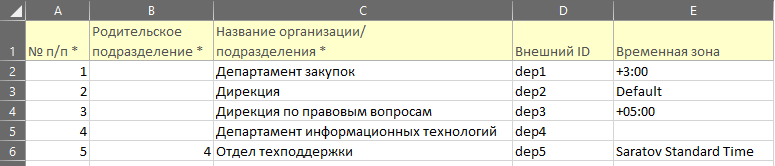 Для подразделения обязательные поля: “№ п/п”, “Родительское подразделение” (если подразделение корневое, то данное поле оставить пустым), “Название организации/подразделения”.