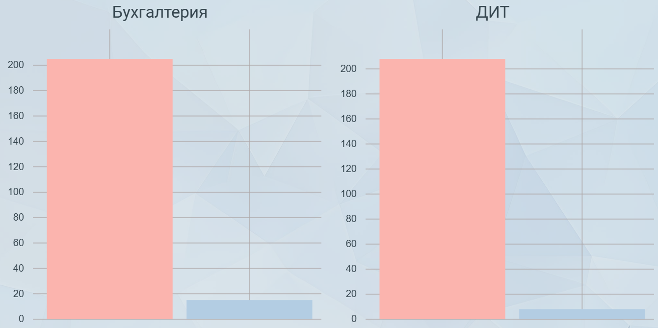 Пример столбчатой диаграммы, построенной на основании представления Текущие задания, источник для оси X - колонка DeptName (Подразделение), Y - Value (Значение):